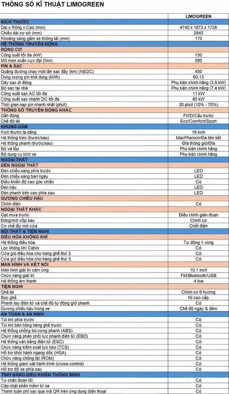 Thông số cơ bản Limo Green